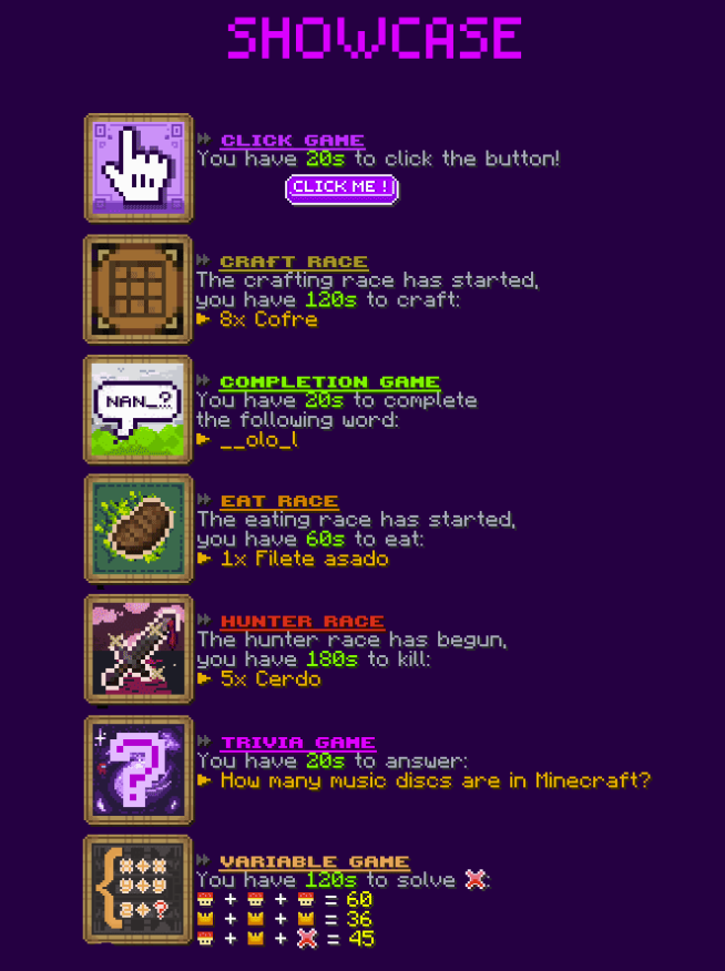 ChatGames is a chat game plugin that lets you play 17 different type of games through chat, with repeat time of event, words, and more customizable settings through config.
