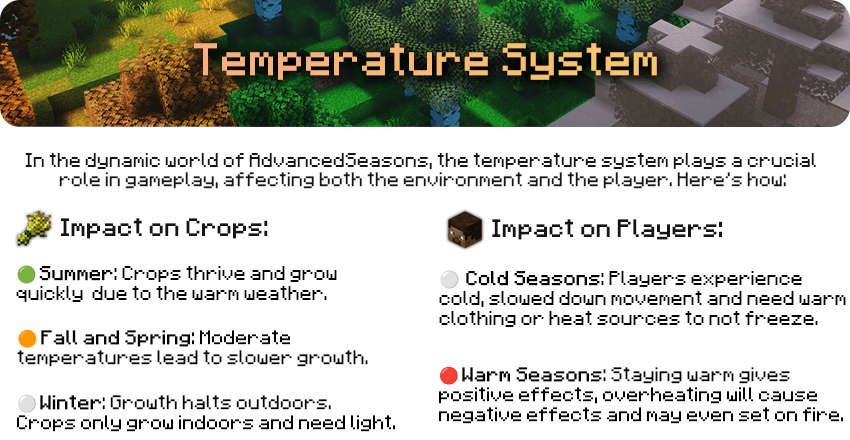 - Custom-built dynamic temperature system. Fully customizable modifiers, from light to time of day, and season/biome temperatures.