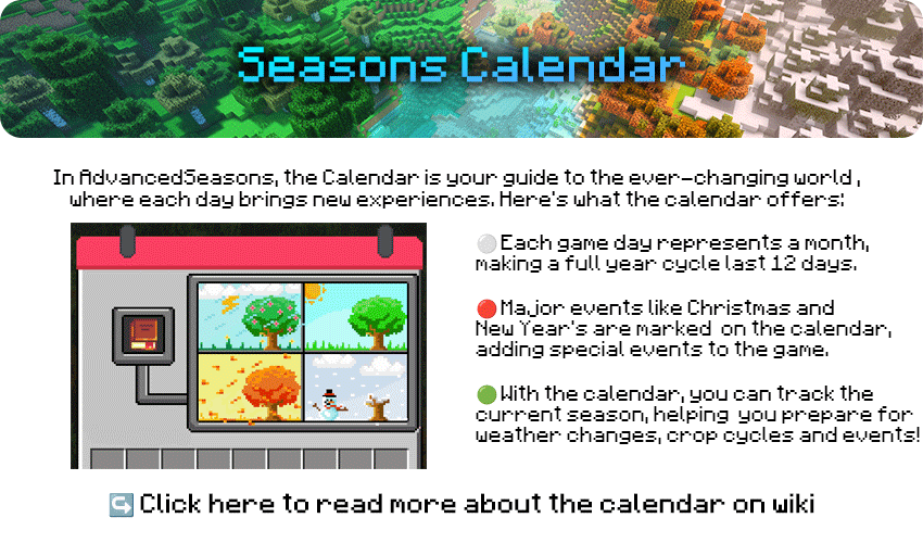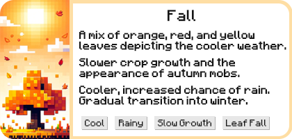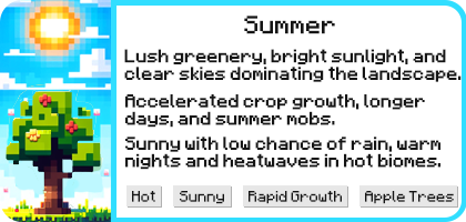 - Fully custom Spring, Summer, Fall, and Winter seasons. These do not modify server biomes in any way.