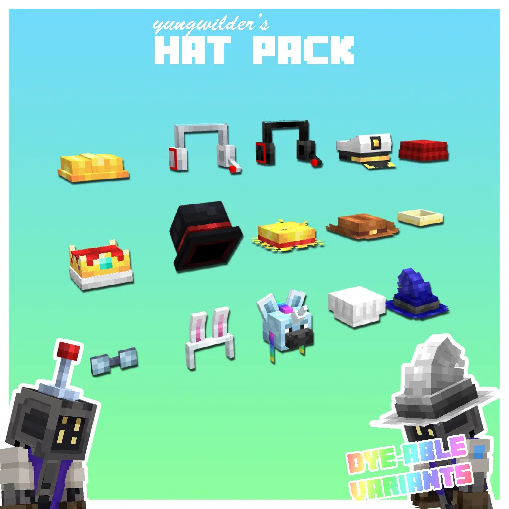A fun hat pack, with 15 unique hats (22 total – 6 hats come with a dye-able variant).